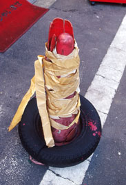 ああっ、車のおしりにぶち当たられて、ぐんにゃりです。うーん、コーンの運命、悲惨。