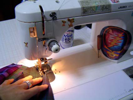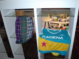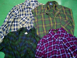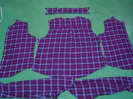 まず素材選びから。リュウタ君の選んだ素材はネルシャツ4枚。あ、ここだ。すでに違いが現れている。そのネルシャツをまずほどいてばらばらにする。そして型抜き。