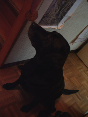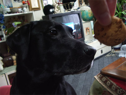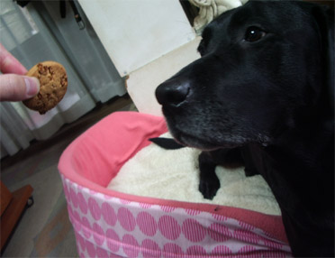 「負け犬」っていうのは 歌舞伎などに妙に傾倒しておっかけになったり はたまたアイドルのおっかけになったり 何かの対象にどっぷり依存してしまう 依存症の傾向があるようです。 では うちのはどうなのでしょうか。 何かに依存して おっかけになったりするのでしょうか。 では さっそく うちの犬が大好きな クッキーを使って その点を検証してみたいと思います。 「はい、モモ、クッキーだよ」 右へ動かすと、