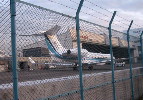 ここはモノレールの線路沿いにある海上保安庁の格納庫。普段なかなか眼にすることのできないような珍しい飛行機(上写 真)に興奮してシャッターを切っていると、パトカーに乗ったおまわりさんがやってきて職務質問をしてきた。