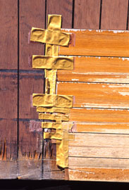 どーん。壁に大穴が空きました。アップリケをタテヨコに一生懸命貼り付けています。