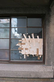 窓ガラスにダンボール紙を当てて、無理矢理貼り付けた感じ。きたないアップリケを思い出すのですが、ラフさがかえっていいのかしら。