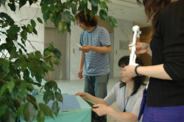 壊れない様にそっとZ君を運ぶ。 デイリーポータルZ用に、入り口を入ってすぐ左、受付の目の前という目立つ場所を用意してくれていた。