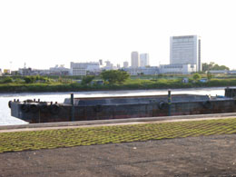 海から10キロほど歩いた場所、なぜか急に船がありました。調べてみると、災害用の緊急の船だそうです。緊急の時はこれに乗って逃げるのか?