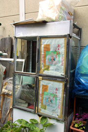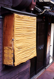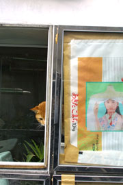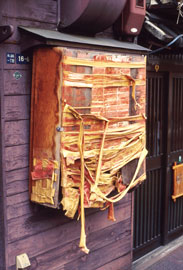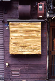 お店の出窓?みっちり貼って、まるで木目のようです。