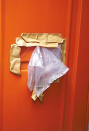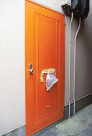 室外機のビニールのカバーの上から、ガムテープを貼りまくってます。ゴワゴワに厚く貼りまくった結果、がばっと持ち上げて取り外せる程の強度を得ました。大作です。