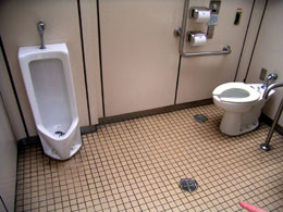 車椅子用のトイレの中に、立ちション用便器が。 つまり小便をしたいだけでも、この広々とした個室に入らねばならない。なーぜー?