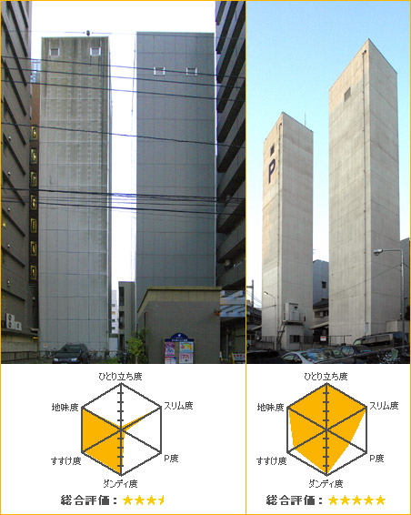 | これまでご紹介したものに比べ格段にビッグサイズな立体駐車場たち。自動車の入り口部分をごらんいただければわかるが、これは複数の立体駐車場を並べて一体化したかたちのものだ。