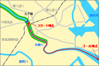 ここで今回のルートを説明しよう。 上記の地図にある通り、丸子橋付近からスタートして、うねうねと17キロほど下って行き、最終的には海に出る。これが、全行程だ。