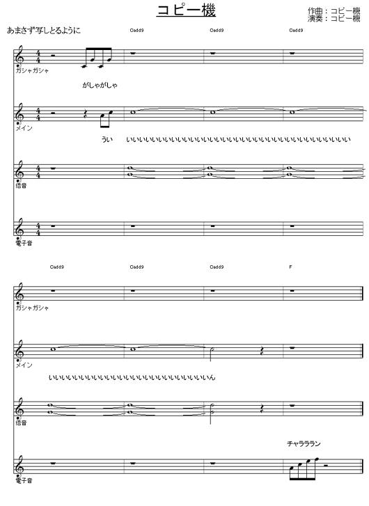 1ページ目でもふれた、「コピー機がコピーするときの動作音」の楽譜は、4パート8小節にわたる大作となった。