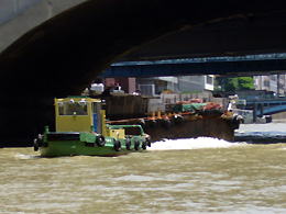 神田川を行く、ゴミの運搬船。千代田区などの燃えないゴミを、お台場の先の埋立処分場に運ぶ。運河としての機能もいまだ健在なのです。 |