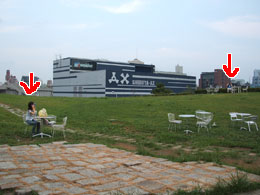 続いて古賀、入店。宮城さんと同じ物を注文して芝生に出ると、宮城さんはすでにずっと距離をとった広場の向こうにいた。野外でも風が吹いて気持ちいい。