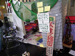 今回の展示のコンセプトは見たまんま、自分の部屋。「そのままもってきたんですよ、だからまったくお金がかかっていない」。という彼女達の部屋はかなりの勢いで居心地がよく、本棚の本を手に取るとそのまま寝転んでページをめくりたくなってしまう。「ちなみに前回のフェスではでかいキャベツを作りました」。癒し系アートの終着点という感じだった。