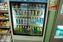 ガラス張りの冷蔵庫の中に飲み物が陳列されている。 この中に、あるか?