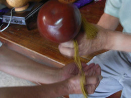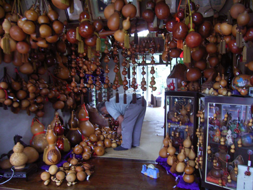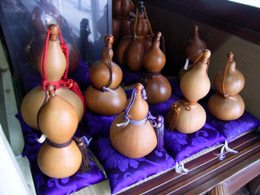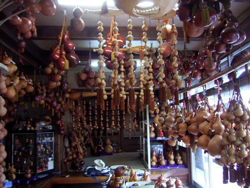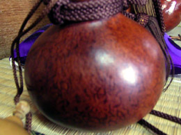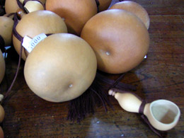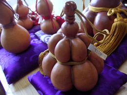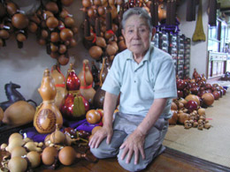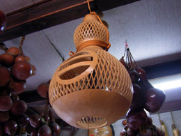 ひょうたん工芸は、できるだけ熟した実を水につけて、中身を腐らせたあと棒で取り去り、乾燥させてから手を加えるのだ。底辺は広く、各地にひょうたんを「趣味」にする人がいて会を作っていたりする。知らなかった。趣味の世界は奥が深い。