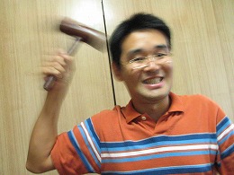自分の頭を木槌で殴る。ごつんごつんという音とともに走る痛み。写真が少し斜めになっているのは、妻が笑いながら写真を撮っているからだ。