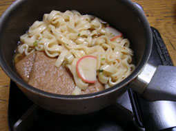 まずは「赤いきつね」を火にかける。汁気がだいぶ減ってはいるが、加熱する分には問題ないだろう。