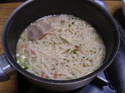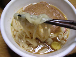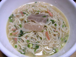どんぶりに入れ替え、食べてみた。…うまい。麺がワンタンのようにフワフワでツルツルだ。