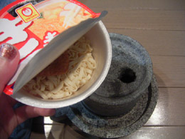最後に、いっぺんやってみたかったことで締めたい。カップうどん丸ごと挽きである。
