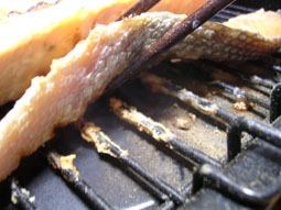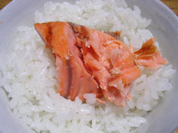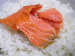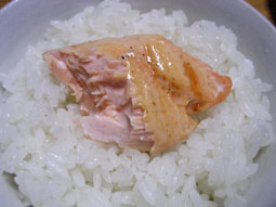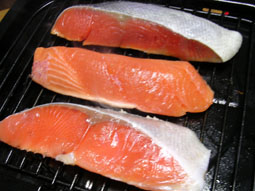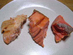 調べてみると、鮭児は一般のシャケに比べて脂肪分が物凄く高いという。まだ発育途中なのに、産卵のために川へ戻る鮭と一緒に行動しているうちに捕まってしまったマヌケなシャケだが、そのぶん脂をたっぷり溜め込んでいるというわけだ。期待が高まる。 |