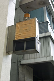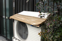 室外機に屋根。そのアイテムだけでもおもしろいのに、さらにコテコテガムテープが。