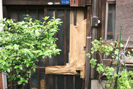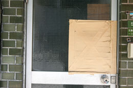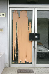 ガラスが割れたドア。下に×に貼った跡も見えています。