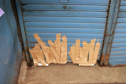 パーキングの看板。全面が貼りつぶされています。この上から文字を書くと、新たな看板にできますね。