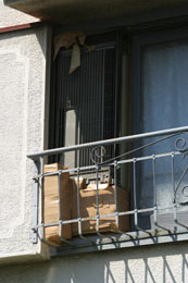 見上げれば、窓に取り付けた送風機がガムテープ色に。