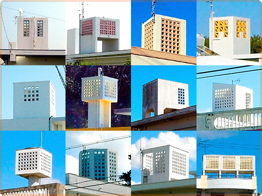 前ページで説明した沖縄特有のコンクリ建築「スラブヤー」の造形にあわせた穴あき水タンク隠し。