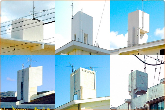 水タンクを隠す建築的意匠。浮かれた造形に意見が分かれるところだ。