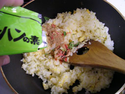 ザザーッと音を立てて、乾燥した具と顆粒の調味料がフライパンへと投入されると、台所中にチャーハンの匂いが一気に漂う。