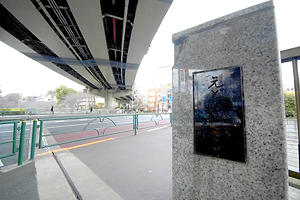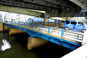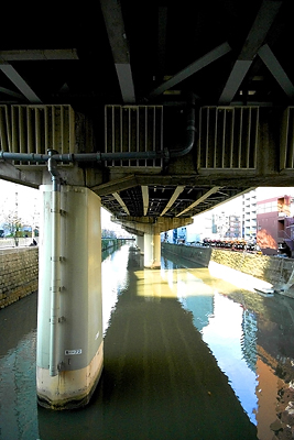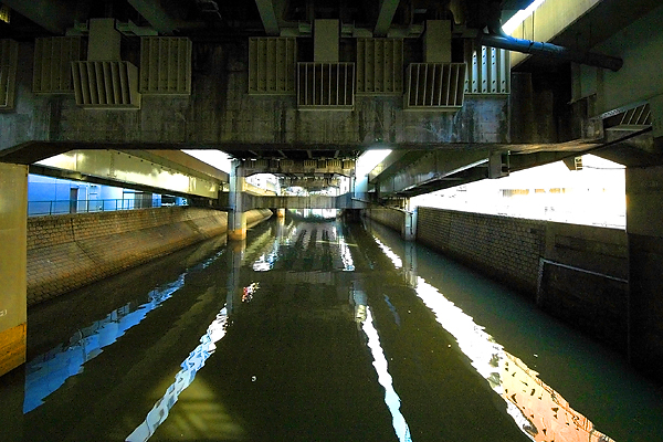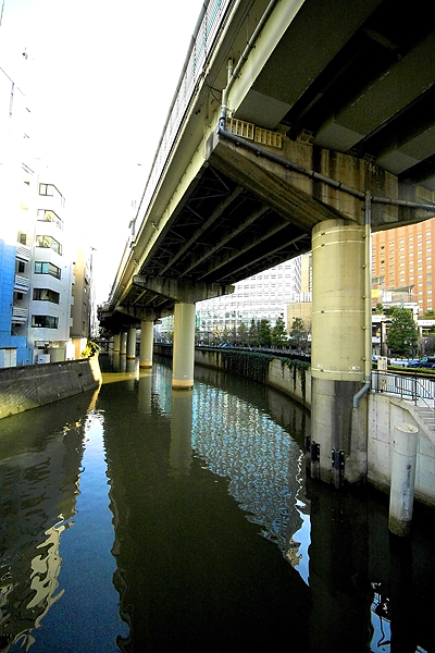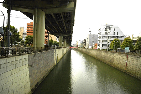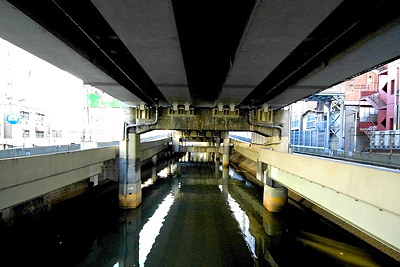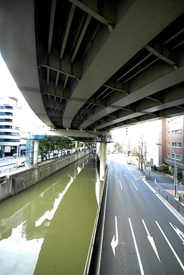 掘留橋のとなりの新川橋から見た高架下。首都高が徐々に高度を上げている