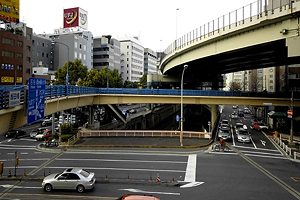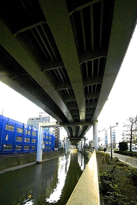 期待通りのなかなかすてきな高架下風景。出入り口に向かって下がっていく首都高の造形にグッとくる。(クリックすると大きな画像が見られます)