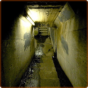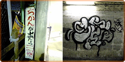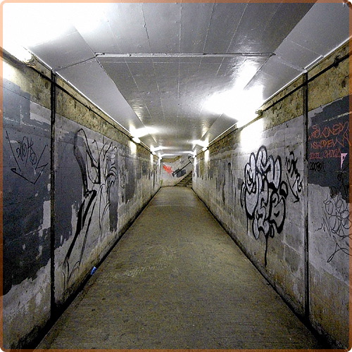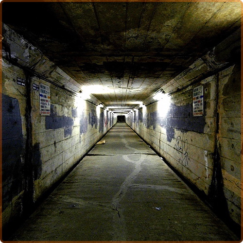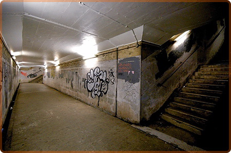 充実した落書きが荒廃感を演出。子供や女性には歩かせたくない、地下歩道の代表格。