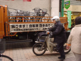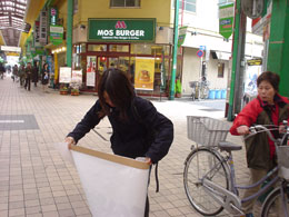 宣伝開始である。まずは商店街を横断幕を手に練り歩こう。大森の商店街へ! |