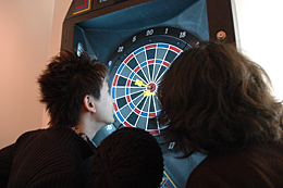 的に当たった事は分かるが、それが何点のエリアなのか分からない。裸眼会のメンバーは一投毎に的に駆け寄り、点数を確認する。