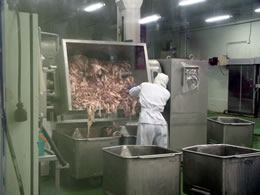 次に、肉に味付けをします。でっかい機械で、肉と塩や香辛料を混ぜ合わせます。一度に大量の肉を混ぜ合わせるため、もはや肉が肉に見えません・・・。まるで工事現場の作業を見ているような錯覚にとらわれます。