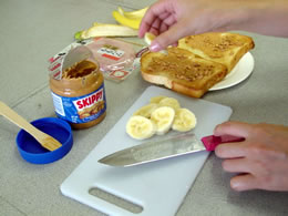 (1)食パン、(2)ピーナッツバター、(3)ハム、(4)バナナ。