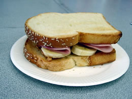 ということで、Woman@niftyのケンタロウレシピにあった、「ハムとバナナとピーナッツバターのサンドイッチ」を、会社のお昼休みに作ってみました。