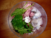 タコが解凍するのを待って、調理を開始。 材料をほどよい大きさに切り、フードプロセッサーに突っ込む。