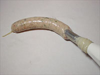 しぼり袋で肉をつめる。ちなみに豚の腸だと、羊の腸より太いので、フランクフルトが出来ます