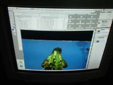 ゴジラだ!!!! 合成用のブルーバック前で撮影されたもの。CG室で作業する前にデジタルデータの色チェックを行います。OKが出ないとまたやり直し。これを10万コマ・・・。 |