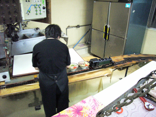 おばさんは慣れた手つきで配電盤を操作、SLは音も立てずに発車し、そのままカタコトと線路を走って僕の席までそばを運んできた。予想だにしない展開にしばし我を忘れて一連の流れを見守っていた。