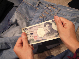 なぜこんな(ポケット物件にしては)大金が出てきたかといえば、このジーンズは音楽フェスなどに履いていく機会が多く、その際手ぶらで行動するために前もって いくばくかのお金(酒代)を、このように小さくたたんでポケットに入れておくのだ。それを出し忘れたらしい。
