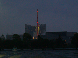 よみうりランドの観覧車は真横から見ると骨組みがふっくらとして厚みがある。 そして、正面から見るとあまり目を惹かないが、車軸付近から垂直にそびえる避雷針がなんとも頼もしい。 まるで、お姫さまとそれを守る近衛兵のようである。