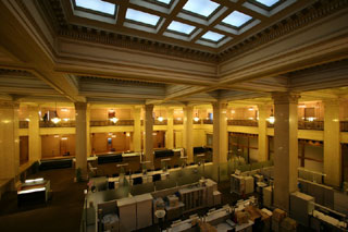 ここの魅力はなんと言ってもエレベーターである。手動式で蛇腹を自分で開く。これがけっこう重たい。しかも、現在では解消されているが、長らく1階、6階、7階にしかエレベーターがとまらず、5階以下の人は階段を余儀なくされていた。さっそくエレベーターに乗って中を拝見させていただこう。