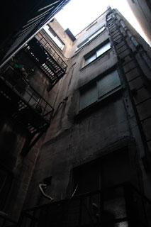 窓から天井を見上げる。こちらは建物の裏にあたり、非常に荒涼とした風景が僕らを魅了してやまない光景である。こういう街に生まれこういう街で育ったのだから、雑居ビルの裏手に郷愁を感じずには居られない。
