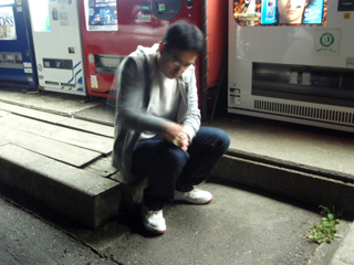 うっかり冷たい缶コーヒーを買ってしまった小男。肩を落としている場合ではない。さっそくこすりはじめ、「つめた〜い」を「あったか〜い」にするのだ。