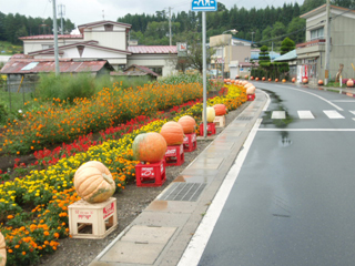 大きな紙を屋外でひろげて道路やら建物やらをトレースし、1分の1の地図をつくるという企画。1分の1だから道路沿いのカボチャも描きこめます。 おもいついたときは「これだ!」と震えたのですが、机上の空論とは得てしてそういうものでした。