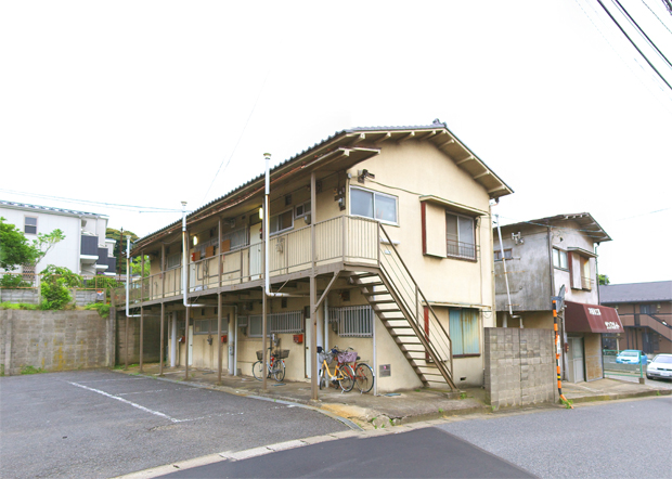 どこをとってもアパート建築セオリーに忠実な名品。一階から屋根上までのびる煙突がかわいい。